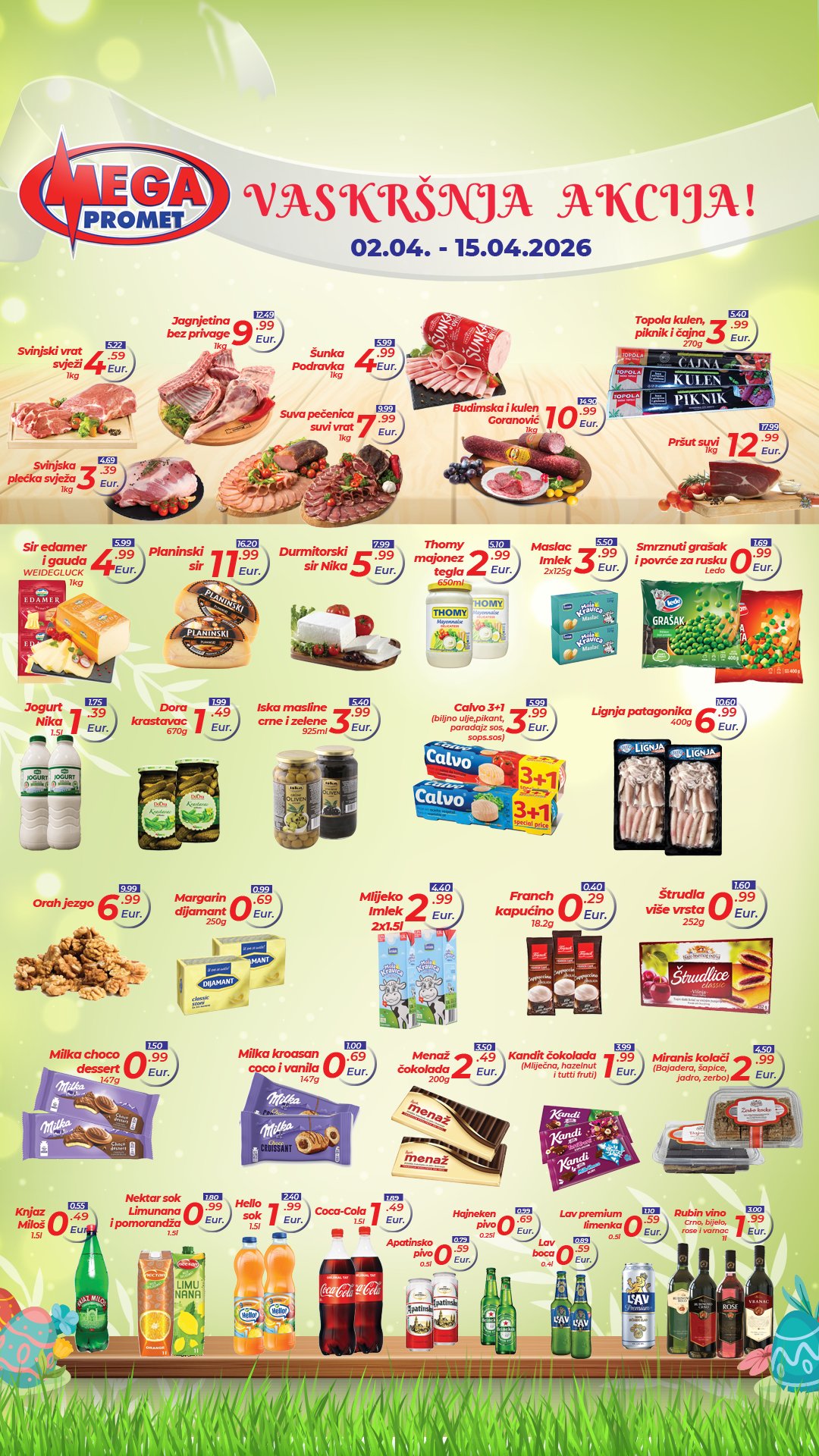 U susret vaskršnjim praznicima, Mega Marketi pripremili su novu Vaskršnju akciju koja traje od 2. do 15. aprila 2026. godine, a kupcima donosi veliki izbor proizvoda po posebno povoljnim cijenama.