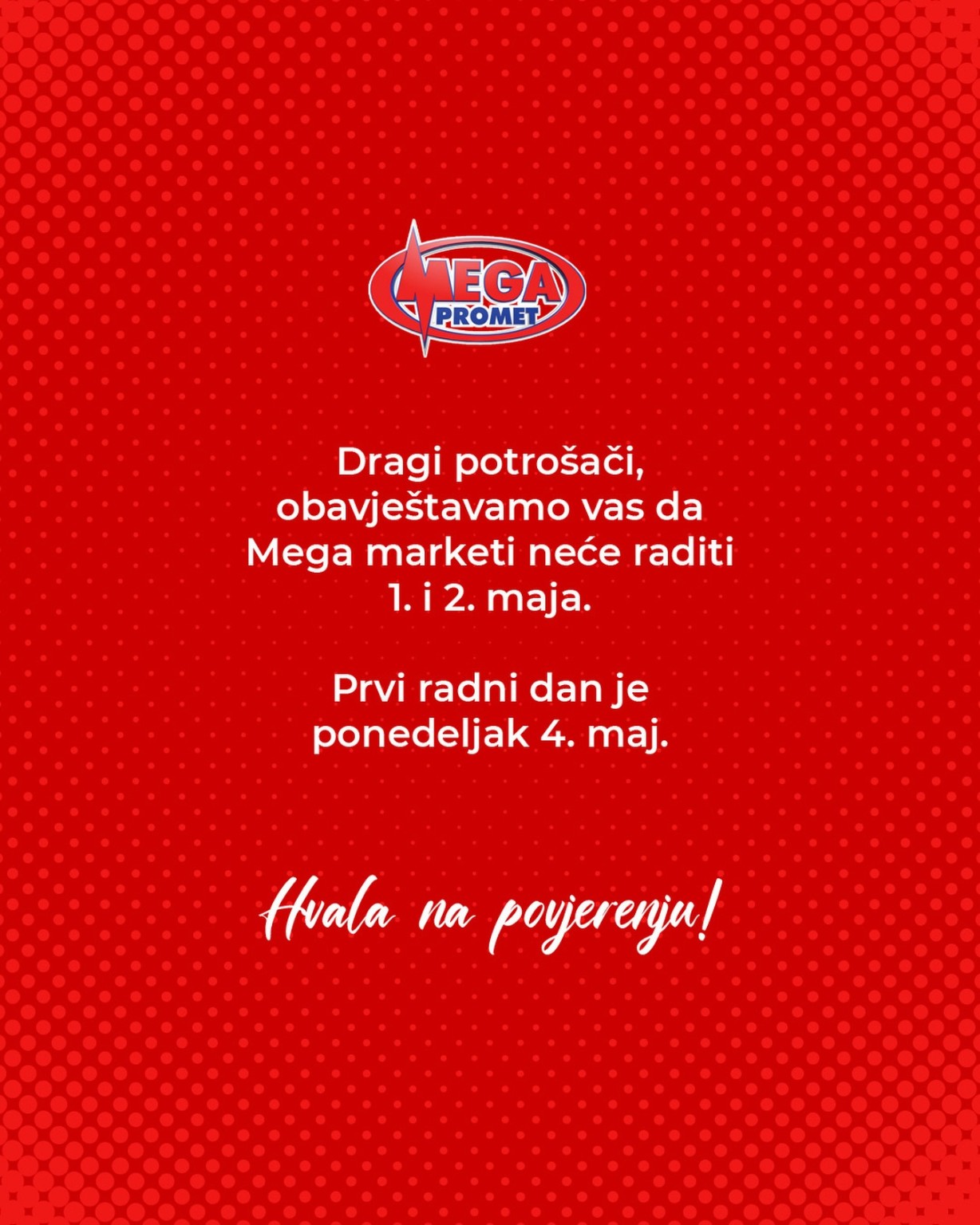 obavještavamo vas da Mega marketi neće raditi 1. i 2. maja, povodom prvomajskih praznika.